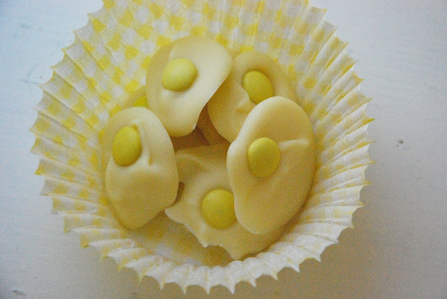 Det är alltid extra kul att göra eget godis att ha i påskägget. Det här är nog det allra enklaste man kan göra. Smält vit choklad och klicka ut på bakplåtspapper, sätt i en gul nonstop och kyl i någon timme. Goda äggulor fixade på ett kick!